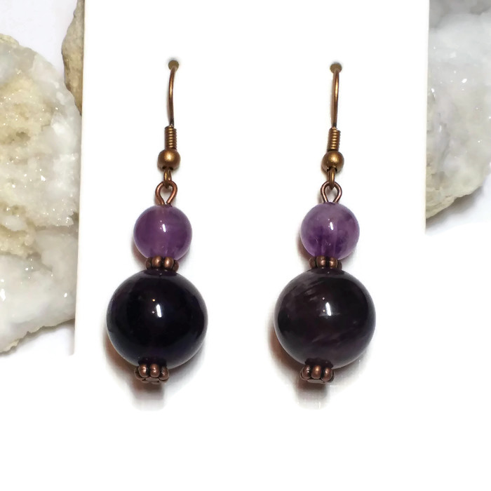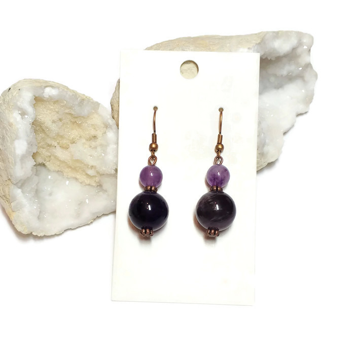 Pendientes de cobre con esferas de amatista que te conectarán con la energía violeta de transmutación, ayudan a equilibrar la energía masculina y femenina, y aportan protección y conexión con energías de alta vibración.