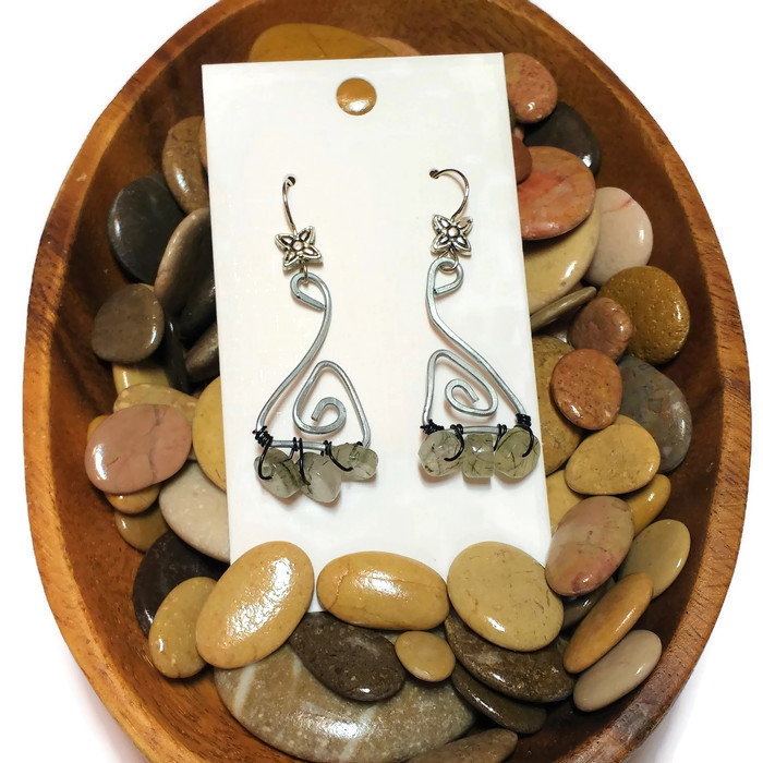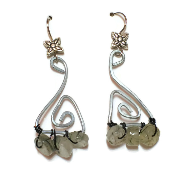 Pendientes con pequeños «donuts» de cuarzo turmalina montados en estructura de alambre plateado.