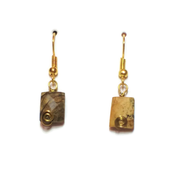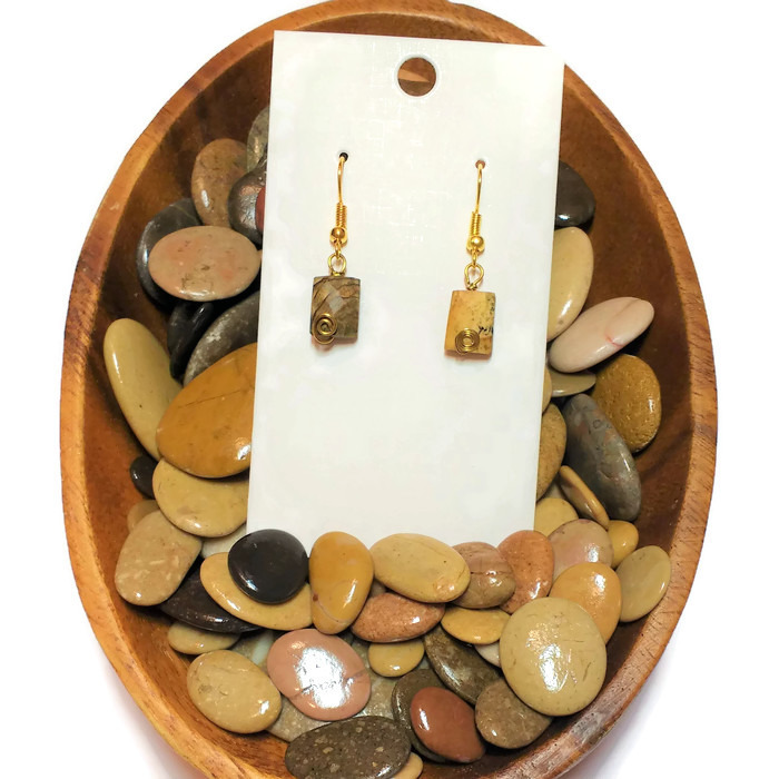 Pequeños pendientes dorados con piezas de jaspe paisaje facetado.