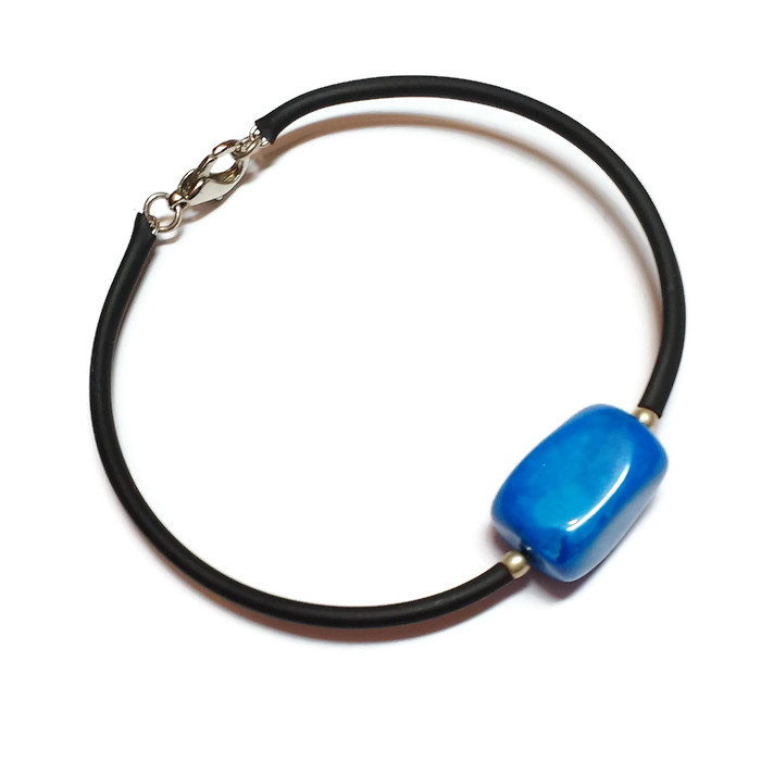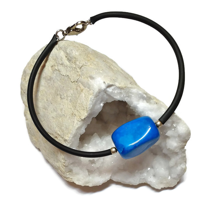 Pulsera de acero memoria recubierto con caucho y con una vistosa ágata azul.